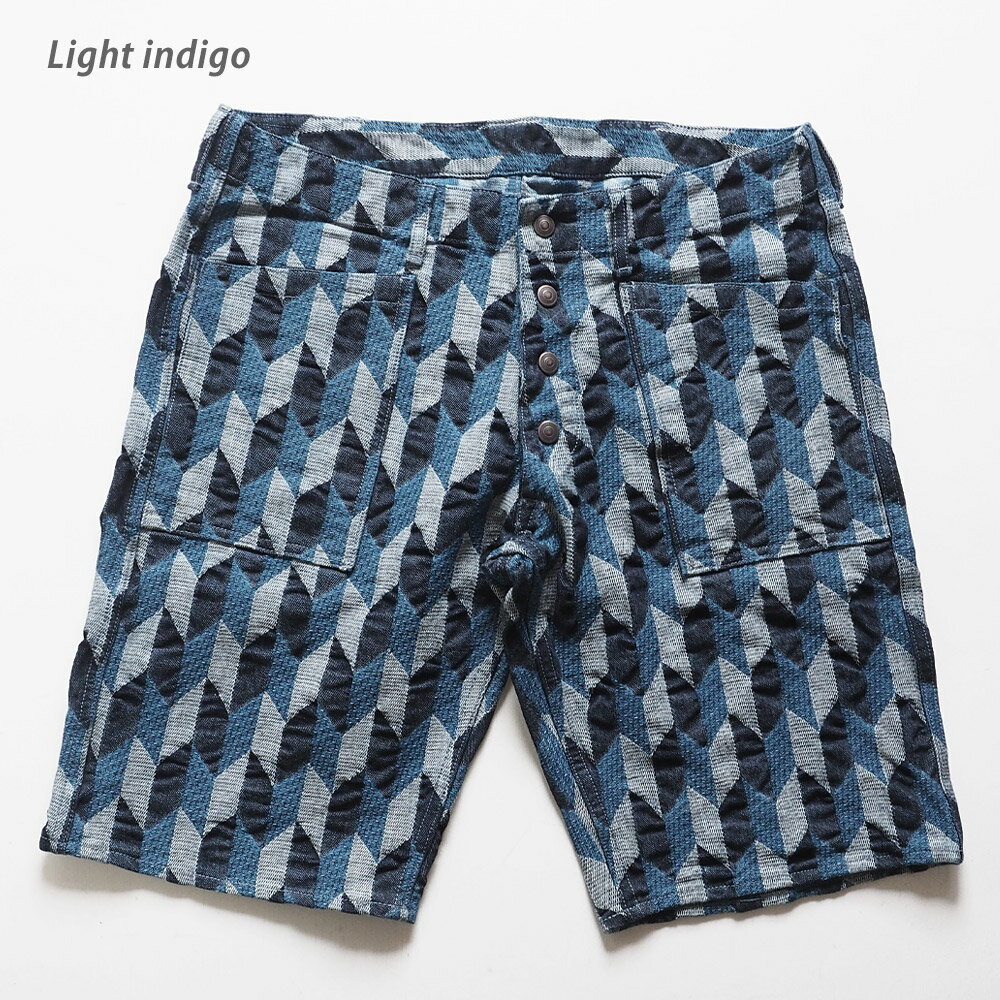 伝統的な矢絣(やがすり)柄とデニムを組み合わせた モダンな雰囲気漂うデニムショートパンツ。
