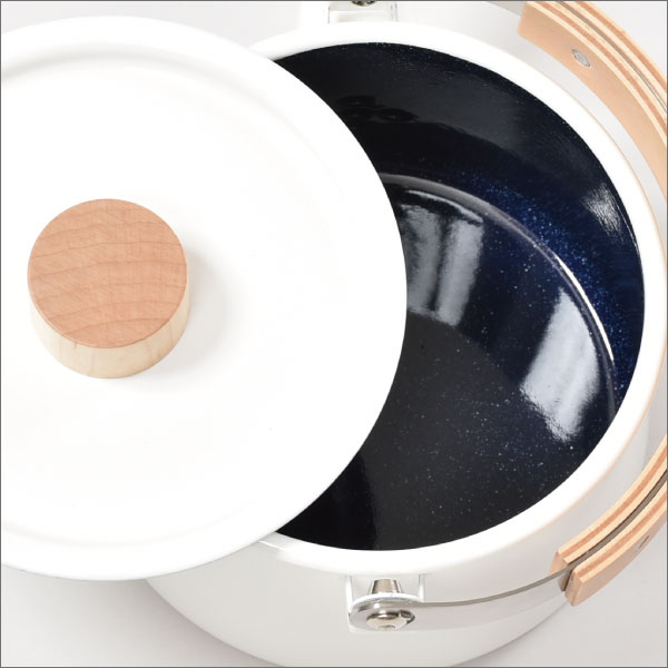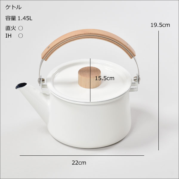 商品詳細 ■サイズ:幅22cm×奥行15.5cm×高さ19.5cm ■満水容量:1.45L ■素材:琺瑯用鋼板、琺瑯、楓、ブナ、18-8ステンレス ■機能:直火・IH対応可 スタッフコメント 良質なホーローをつくりたい。