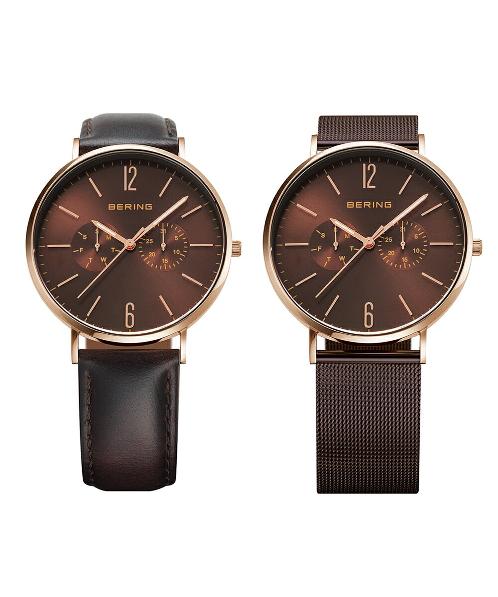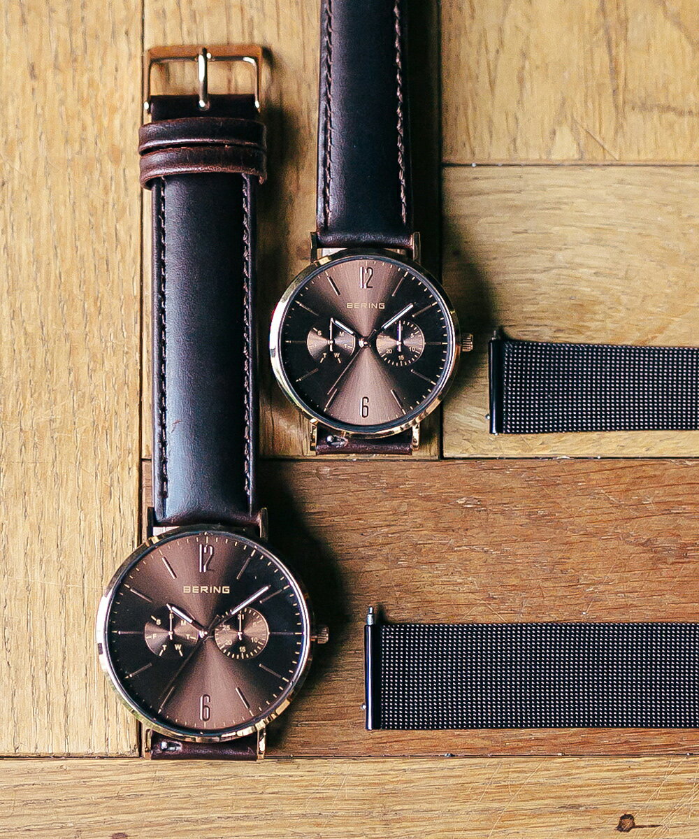 国内正規品【BERING】ベーリング BERING ペアウォッチ ブラウン文字盤 革ストラップ付 ステンレスメッシュベルト付 文字刻印可能【プレゼント】【シンプル】【北欧】40ミリと36ミリモデル2本での価格 日本限定【14240-265&14236-265】
