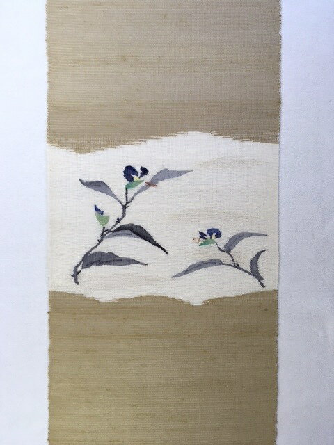 和辛子色の地色に露草が上品です! 綴れの帯と同じように、下絵を経糸の下に置き、それを見ながら小さな杼で柄をすくうように織られた絽のすくい織の帯です。