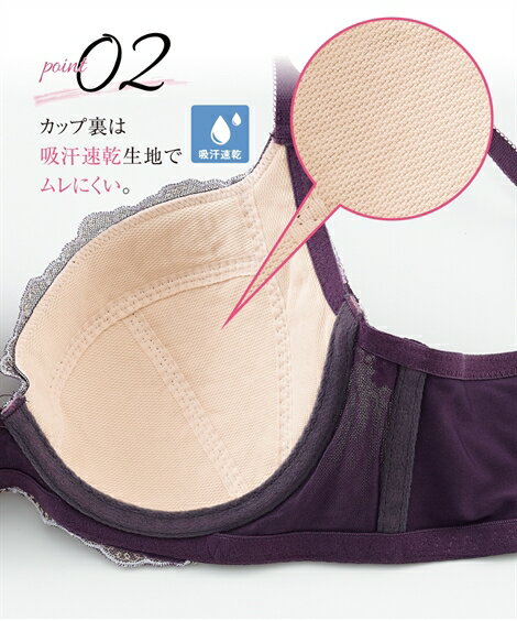 カップ裏は吸汗速乾生地でムレにくく、サイドボーンがないからやさしい着けごこち。