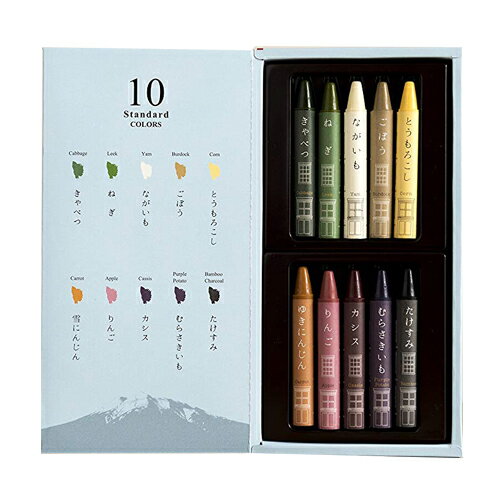 ●成分:ライスワックス・野菜粉末・食用色素 ●内容色:きゃべつ、ねぎ、ごぼう、ながいも、とうもろこし、雪にんじん、りんご、カシス、紫いも、竹炭(10色セット) ●サイズ:W100×D20×H192mm ●ご使用上の注意:食べ物ではありませんので、飲み込まないようご注意ください。