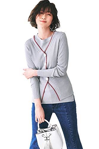 RUIRUE BOUTIQUE(ルイ・ルエ・ブティック) バイカラー ライン ニット カーディガン レディース ミセス ママ ショール 春ニット サマーニット リブニット カジュアル 上着 羽織 長袖 大きいサイズ グレー×ディープピンク(PGY)