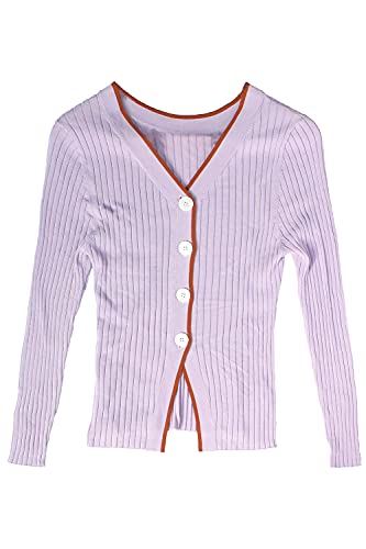 RUIRUE BOUTIQUE(ルイ・ルエ・ブティック) バイカラー ライン ニット カーディガン レディース ミセス ママ ショール 春ニット サマーニット リブニット カジュアル 上着 羽織 長袖 大きいサイズ ラベンダー×テラコッタ(PPU)