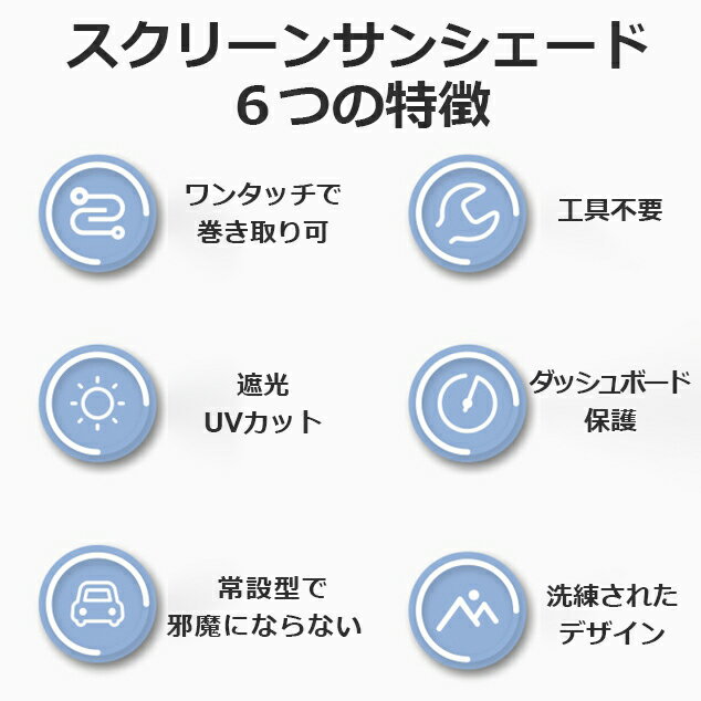 ◆製品内容 スクリーンサンシェード本体×1 予備取り付けユニット×2(形状違い) 取り付け説明書×1(日本語) サイズ別適合目安車種一覧(車種は目安ですので、幅やサンバイザーなど予めご確認の上ご購入ください。