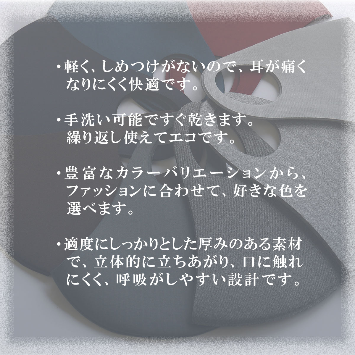 商品情報素材ポリエステル95%ポリウレタン5%サイズ大人用マスク(普通〜大きめサイズ)縦 約13cm【単色3枚入り】3Dフィットマスク(洗える・普通〜大きめサイズ)ファッションマスク 深緑 ブラウン 濃ネイビー ワインレッド ダークグレー 杢チャコールグレー 杢ライトグレー ライトグレー ベージュ サックス 薄ピンク ホワイト 立体 3D 3d 洗ってくり返し使える立体マスク やわらかい三層構造 耳が痛くなりにくい 【お知らせ】 ご要望の多かったお好きな色を選べる3枚セットが販売開始しました!毎日マスクの着用が必要なこのご時世、ご自分に似合う色を見つけたり気分を変えたいときに是非お試しくださいませ。