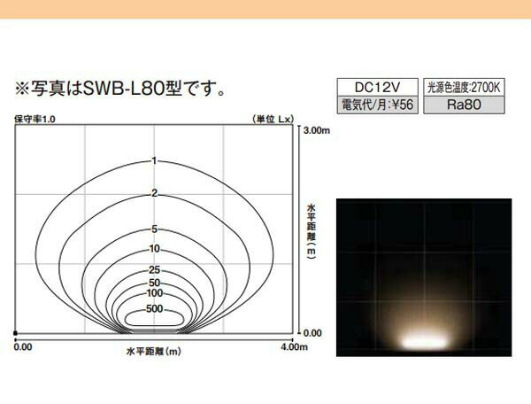 【12V照明】美彩シリーズ ウォールバー ライト の商品説明 商品名 【12V照明】美彩シリーズ ウォールバー ライト SWB-L80 8VLH49AB カラー オータムブラウン 商品 詳細 消費電力:8.7W 器具光束:399lm 灯具 [奥行き40・高さ85・幅800mm] ・1.2kg ●スパイク施工用/防沫型 ●パネル:アクリル樹脂 ●灯具本体:アルミ形材、アルミダイカスト ●ケーブル長3.0m(防水コネクター付) ●可動範囲上下37.5度 ●固有エネルギー消費効率45.9lm/W 特 記 ■12V照明 「美彩シリーズ」にはトランス、ケーブルが必要となります。