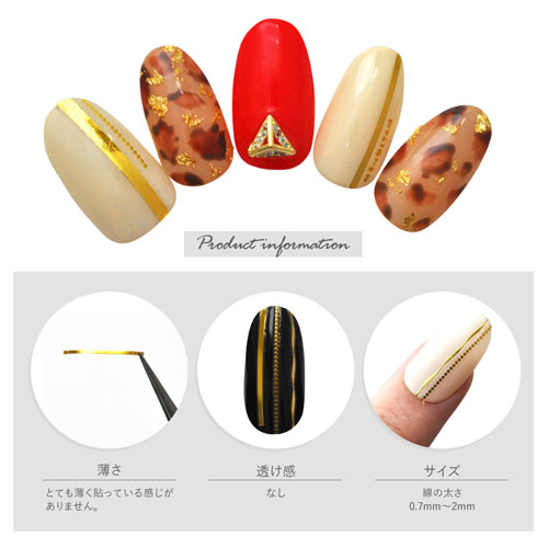 製品情報 梱包数 1枚 サイズ 台紙サイズ:10.3cm×8cm 発送方法 メール便190円/佐川急便470円(沖縄・離島以外)/ゆうパック410円〜 用途 ジェルネイル・レジン用品 オススメポイント 色々なラインネイルシール(Various lines) 定番になったメタルのラインアート。