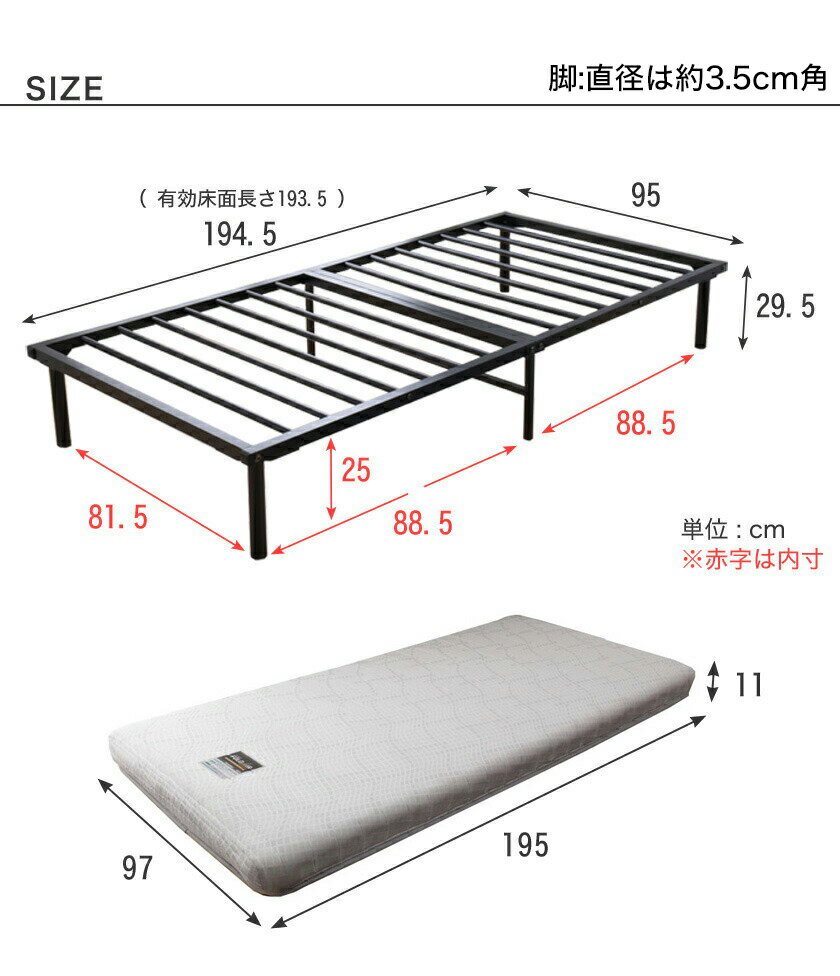 サイズ(約) ベッドフレーム:幅80×長さ194.5×高さ29.5cm マットレス:幅97×長さ195×厚さ11cm 材 質 ベッド:スチール、粉体塗装 ▼マットレス:高密度連続スプリング(R)R-one 生地:表ドビー、裏ジャガート 機能:防ダニ、抗菌防臭加工(衛生マットレス) 耐荷重(約) 150kg 組 立 お客様組立(大人2名:約30分) 生産国 フレーム:中国製、マットレス:日本製 梱 包 (フレーム)102×33×16.5cm(18.6kg) (マット)27×27×102.5cm (12kg) その他・注意事項 ※マットレス開梱後、完全に膨らむまでに約72時間かかります。