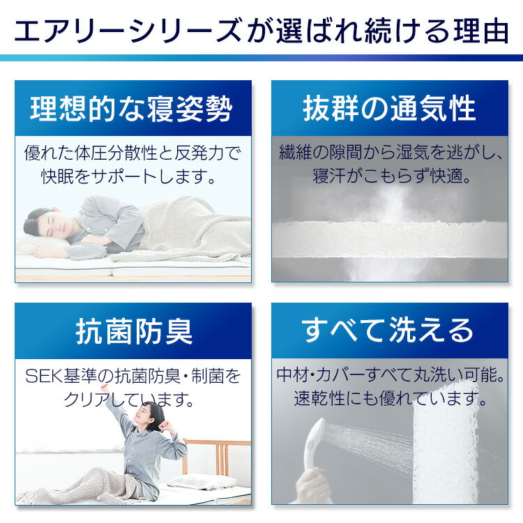 従来のマットレスに比べてクッション性、体圧分散性、通気性、耐久性に優れた、丸洗い可能な素材です。
