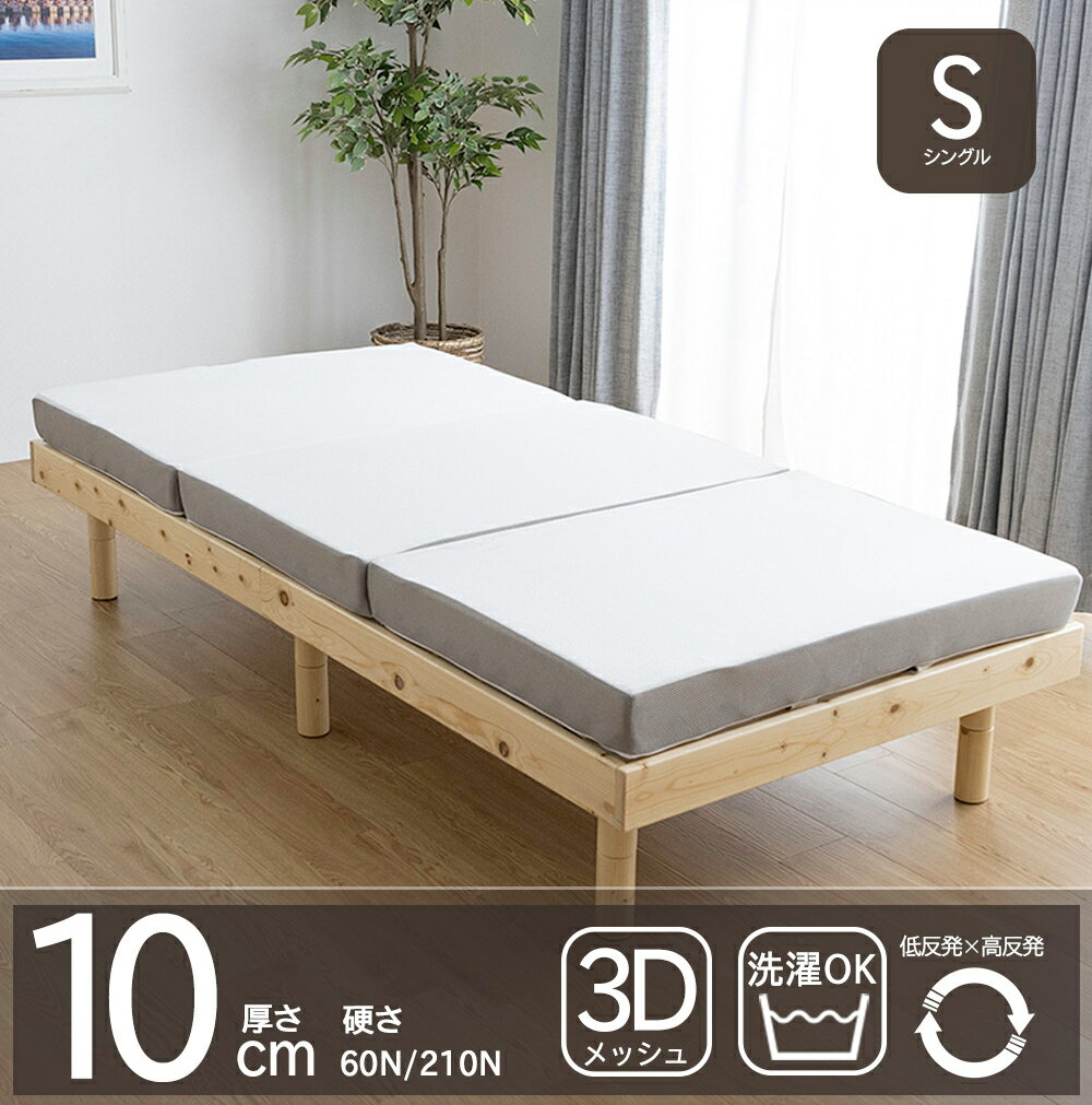 ※こちらの商品の配送区分:【A】 商品名 三つ折りマットレス シングル 商品説明 ○低反発×高反発を自由に組み換え ○二層構造のマットレス ○三つ折りタイプ ○通気性に優れた3Dメッシュ仕様 ○4段階の硬さが変更できるマットレス ○低反発側は接触冷感素材のジェルを使用 サイズ 幅95×長さ197×厚み10cm 梱包サイズ 【1】39×39×54cm 仕様 中材:ウレタン 低反発:28D 高反発:30D カバー:ニット生地、ファブリック(100%ポリエステル)三つ折りマットレス