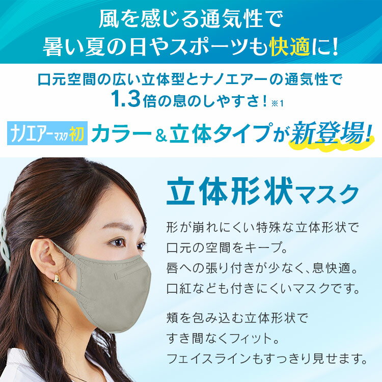“息や会話がしやすい、立体形状マスク”形が崩れにくい特殊な立体形状で口元の空間をキープ。